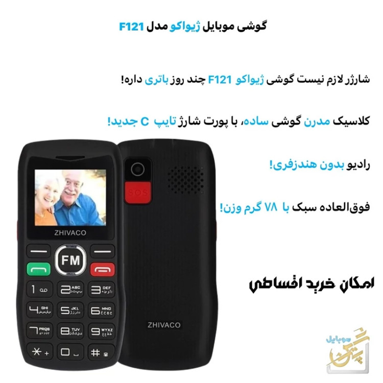 گوشی ساده دکمه ای Zhivaco F121 کلید بزرگ دارای کلید SOS صدای قوی شارژ بالا چراغ قوه رادیو دوسیم کارت رم خور