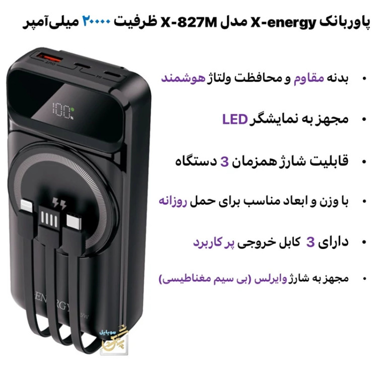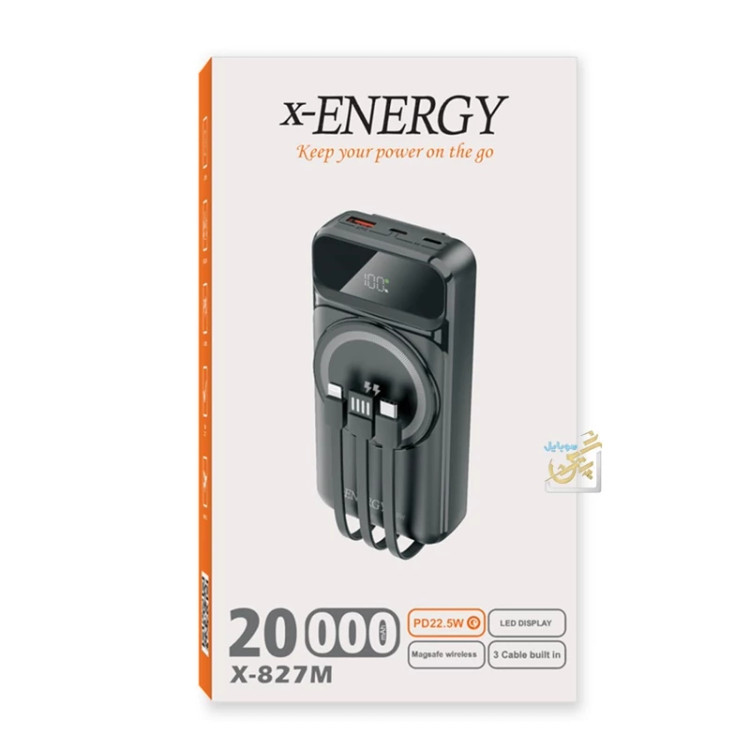 پاور بانک X-Energy مدل X-827M دارای شارژ سریع 22.5 وات نمایشگر LED و سه کابل همراه